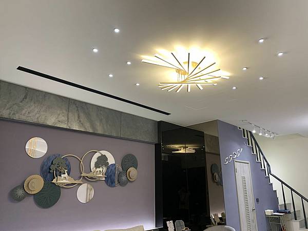 天花板上則跟樓下的客廳有著相同樣式系列的設計感燈飾(ㄧ樣也是衡定理民宿管理客製化設計的)