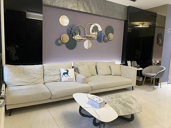 在客廳的空間中,還有灰白色的高質感沙發,以及大理石的桌子,桌子上還擺有相同大理石樣式的面紙盒(連細節的整體感設計都有考量進去)!