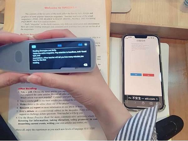 選擇[開啟同傳]✅後,並用手機掃描QR Code[進入]掃描模式!並且將翻譯筆掃描要翻譯的整句話/或段落,完成後可以選擇保存(與歷史紀錄當中)或是上傳(手機中)即可複製!
