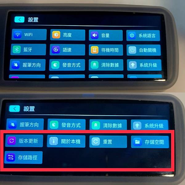 [設置]的部分還可以針對個人習慣的需求,而設定!譬如如果習慣用左手握筆,則可選擇握筆方向、發音的速度可以調整,以及其他像鬧鐘、天氣等等的資訊